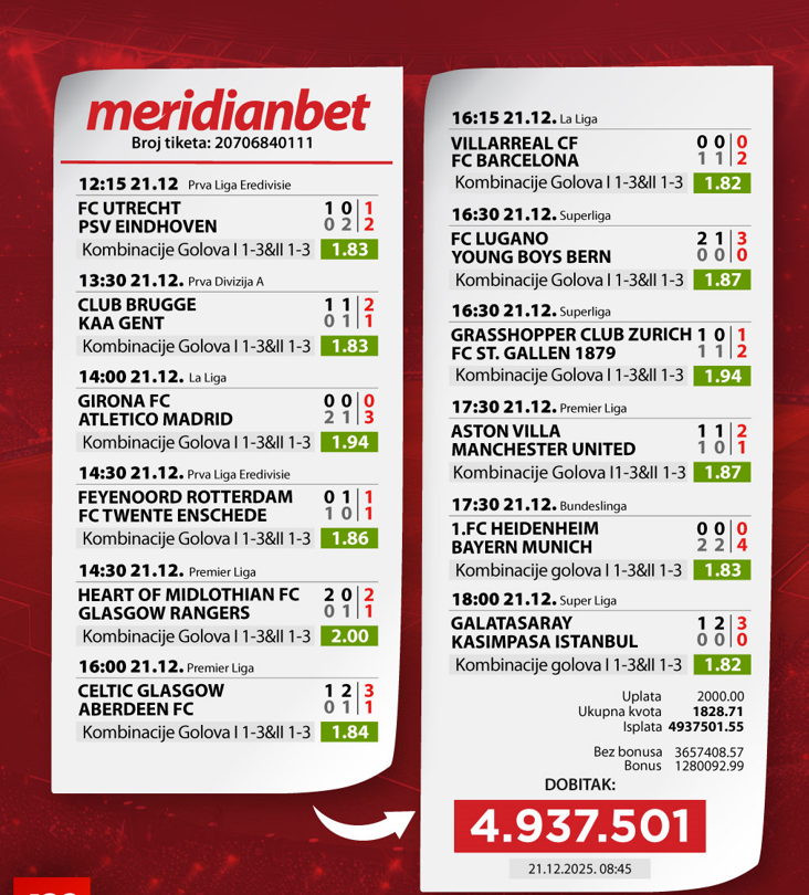 Dvanaest pažljivo odabranih parova, ulog od 2.000 dinara i neizostavan začin u vidu sportske sreće bili su dovoljni da jedan tiket donese impresivan dobitak od čak 4.937.501,55 dinara.